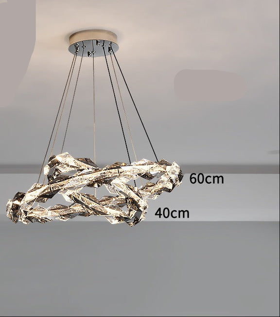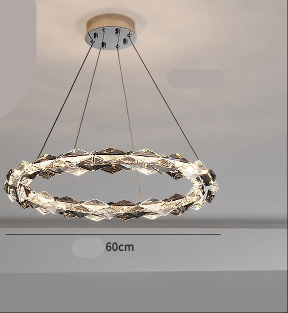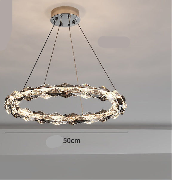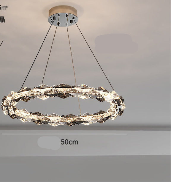Modern crystal ring chandelier with premium LED lighting. Ideal for dining, living rooms, and high-ceiling spaces. Multiple sizes and light colors available.