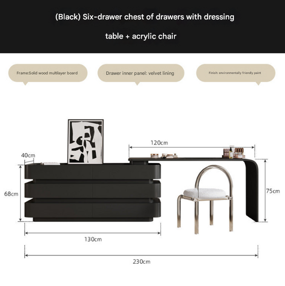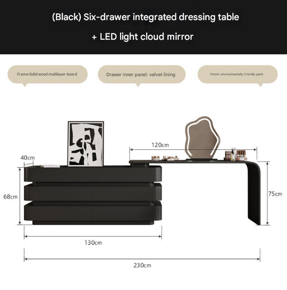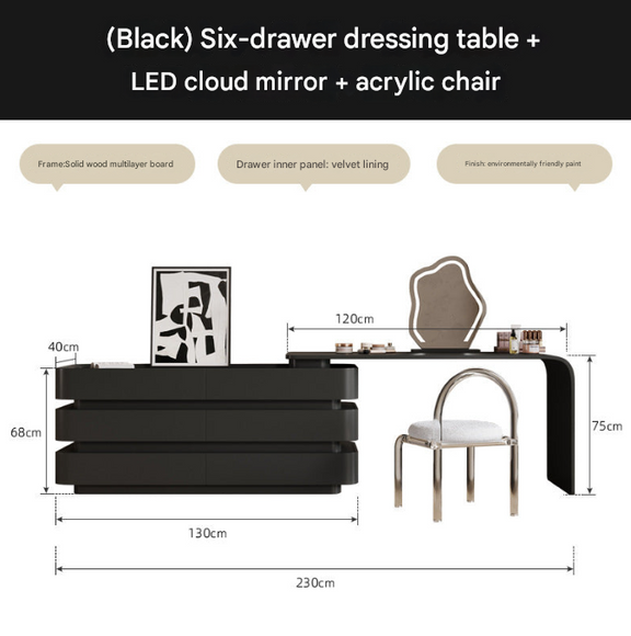 Black Luxury Dresser with Cloud Mirror & 6 Drawers – Modern Vanity Table Set