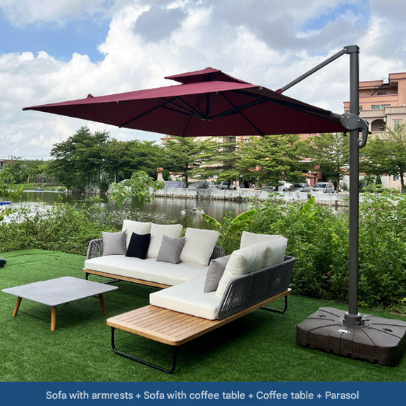 | Included Accessories | Cushions, coffee table, parasol (based on selected variant) |