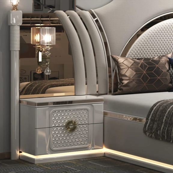 White Leather Bedroom Set with Fan-Shaped Headboard, Dresser & Nightstands