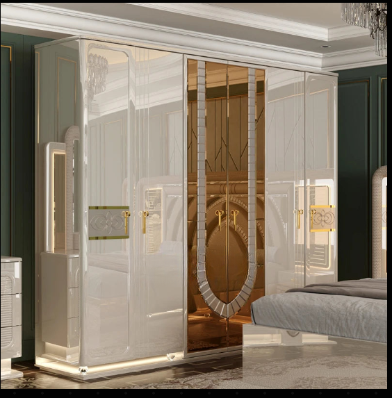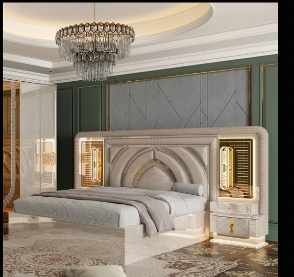 Feature* Details Appearance Modern Luxury Brand Name SSS Home Needs Model Name M-8860 Customizable or not Yes – Size, Upholstery, Finish Details of Installation Simple assembly; Instructions provided Main Material Wooden MDF + Fabric + Metal + Glass Headboard Style Arched upholstered design with LED lighting Finish & Accents Glossy lacquer + gold mirror details Storage Bed with integrated storage + wardrobe + dresser Style Positioning Modern, Classic Luxury Function Complete 5-piece bedroom set: bed, 2 nightstands, wardrobe, dressing table Gross Weight Varies by set size; volumetric calculation recommended Size Options Full / King Origin Guangdong, China Applications Bedroom, Hotel, Apartment, Villa