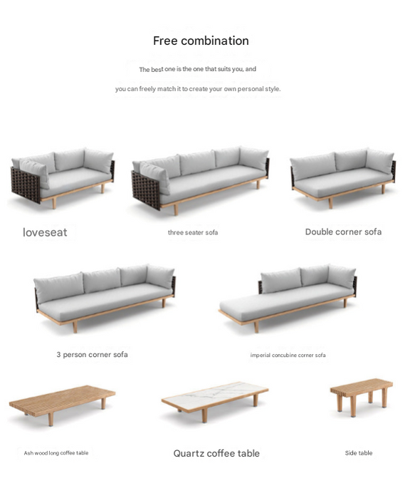 | Included Accessories | Cushions, 2 Coffee Tables (rock board + wood), Modular setup |