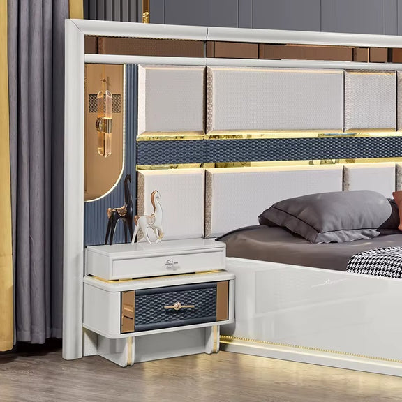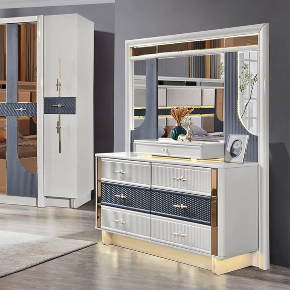 Modern Grey and Gold Bedroom Furniture Set with LED Headboard, Mirror Wardrobe, and Dresser Unit